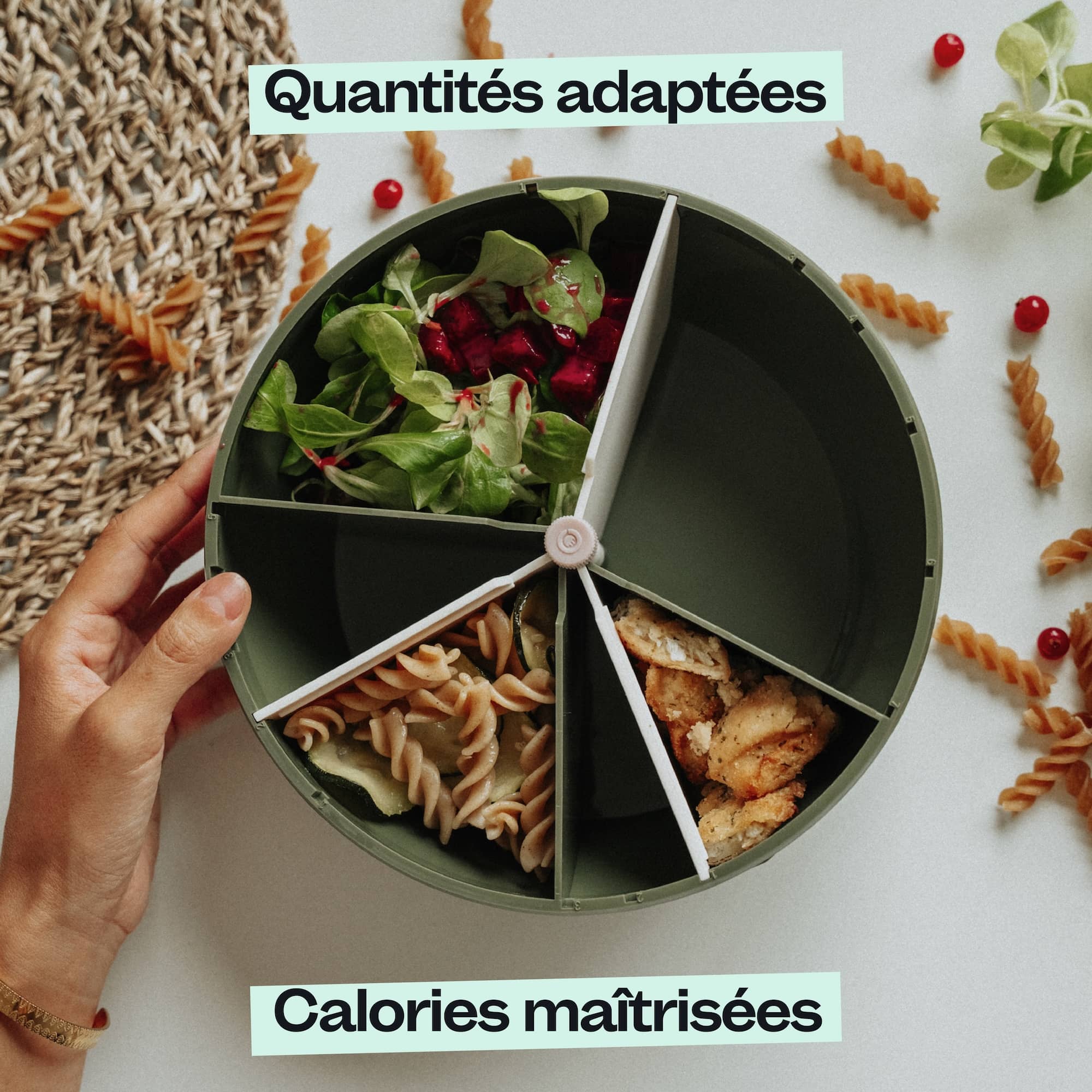 Le bol Maju est révolutionnaire ! Plus besoin de peser les aliments, ni compter les calories. Il suffit de remplir les compartiments et c'est prêt !